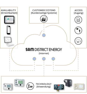 SAM DISTRICT ENERGY es una aplicación basada en un portal para gestionar, operar y optimizar sus sistemas de calefacción. Todos los datos importantes de los reguladores, contadores de consumo y accionamientos eléctricos conectados se guardan en una ubicación central. Para acceder al SAM DISTRICT ENERGY se puede utilizar cualquier dispositivo móvil inteligente. Acceda a SAM DISTRICT ENERGY desde su teléfono móvil, tableta u ordenador portátil.